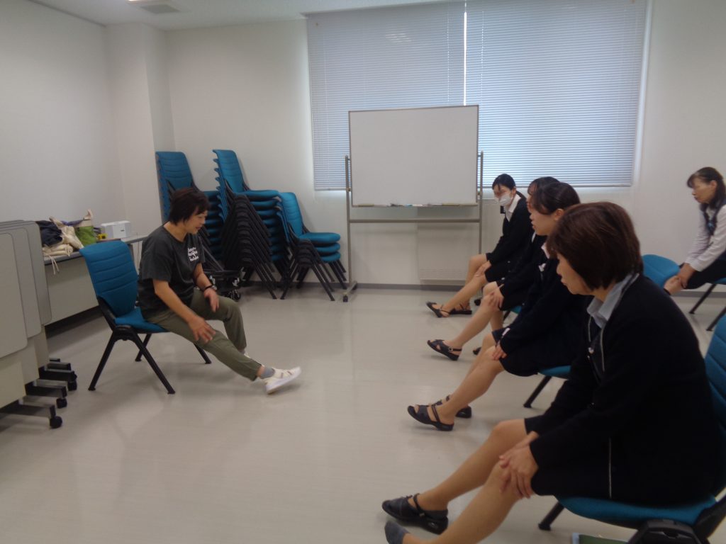 椅子に座って体ほぐしストレッチをして、体を温めて歪みをとっていきました。