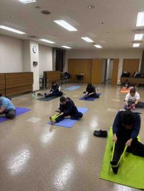 ゆっくりと呼吸と共にストレッチを行いました。体の硬い人はヨガベルトを使い無理なく…
